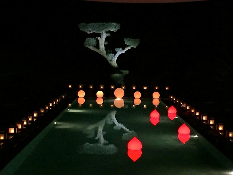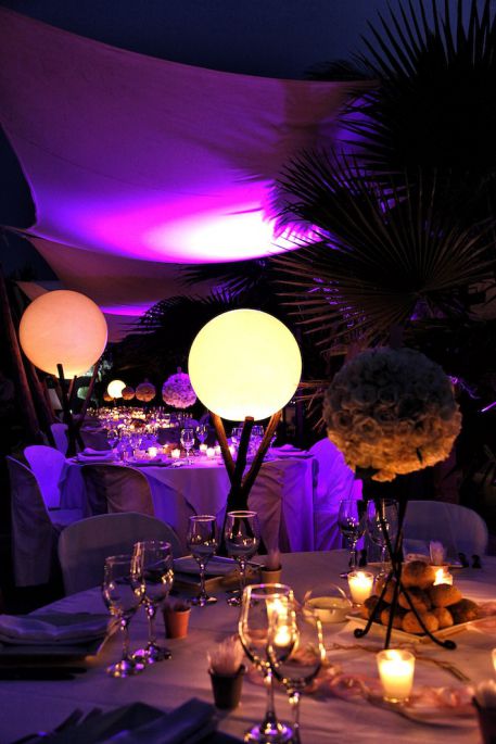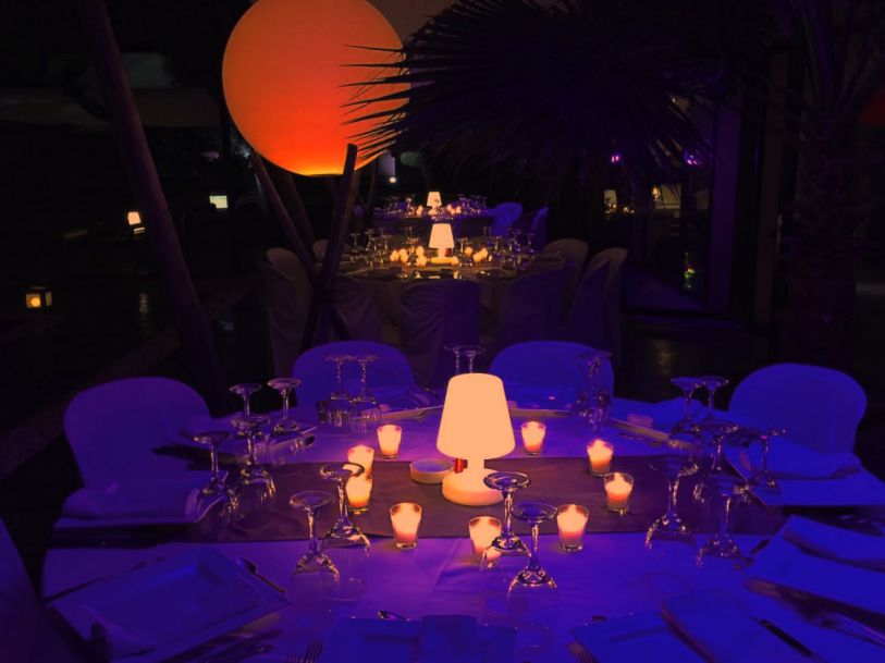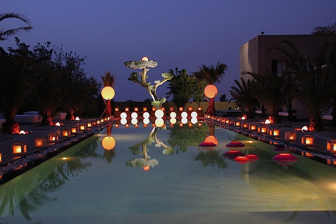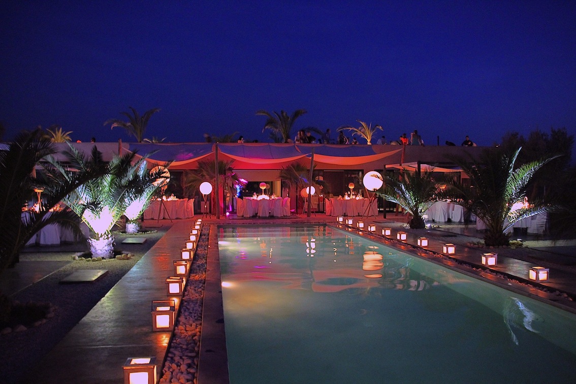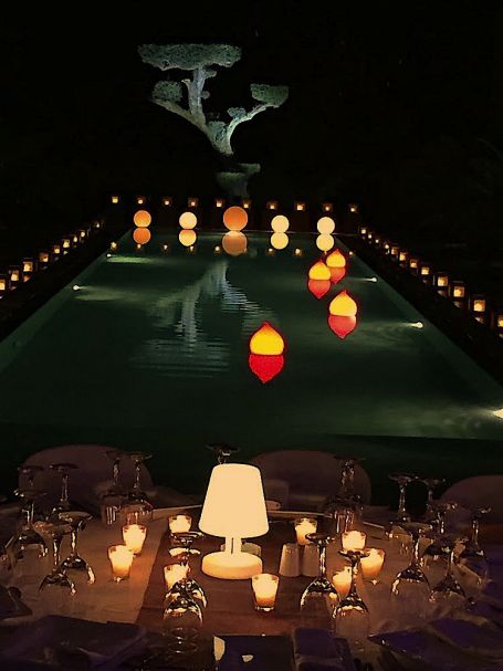 Soirée d'anniversaire : cocktail, diner au bord de la piscine bordée de lanternes avec bougies